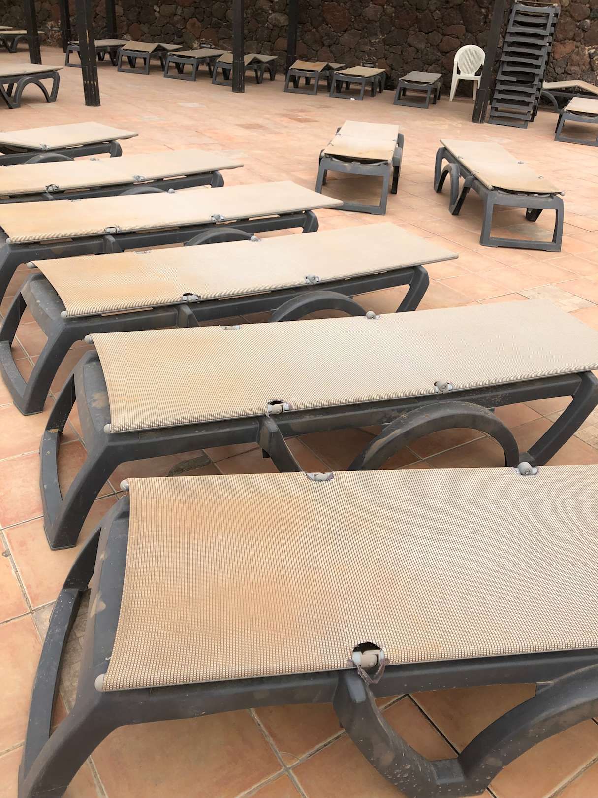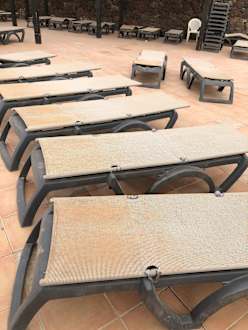 So sahen die unbenutzten Liegen nach einer Woche immer noch aus. Wenn sich jemand mit dem Handtuch darauf gelegt hat, waren die dann allerdings etwas sauberer.