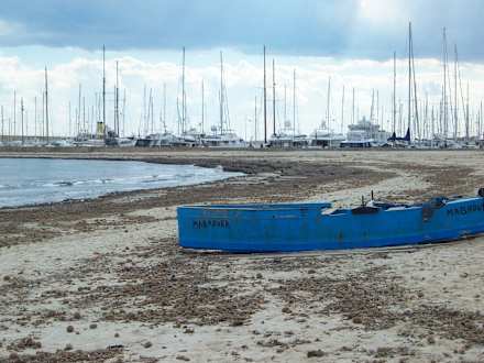 Strand vorm HotelSogar ein alter Kahn wurde angespült!