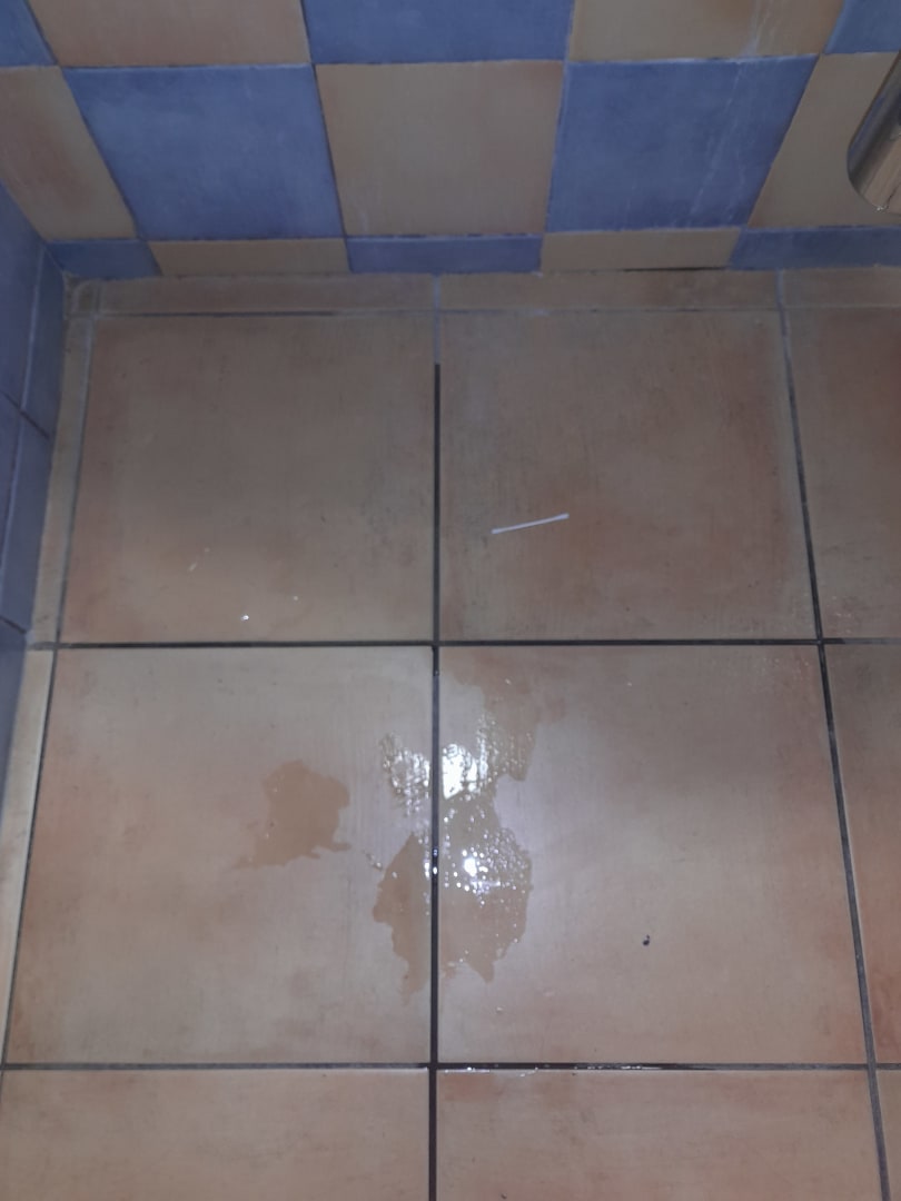 Wasser unterm Waschbecken, nach Nutzung, da Abfluss undicht.
