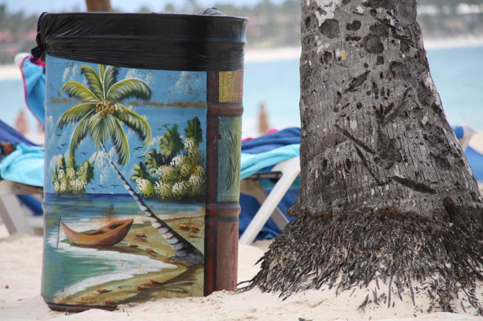 Verschieden gestaltete Mülltonnen am Strand