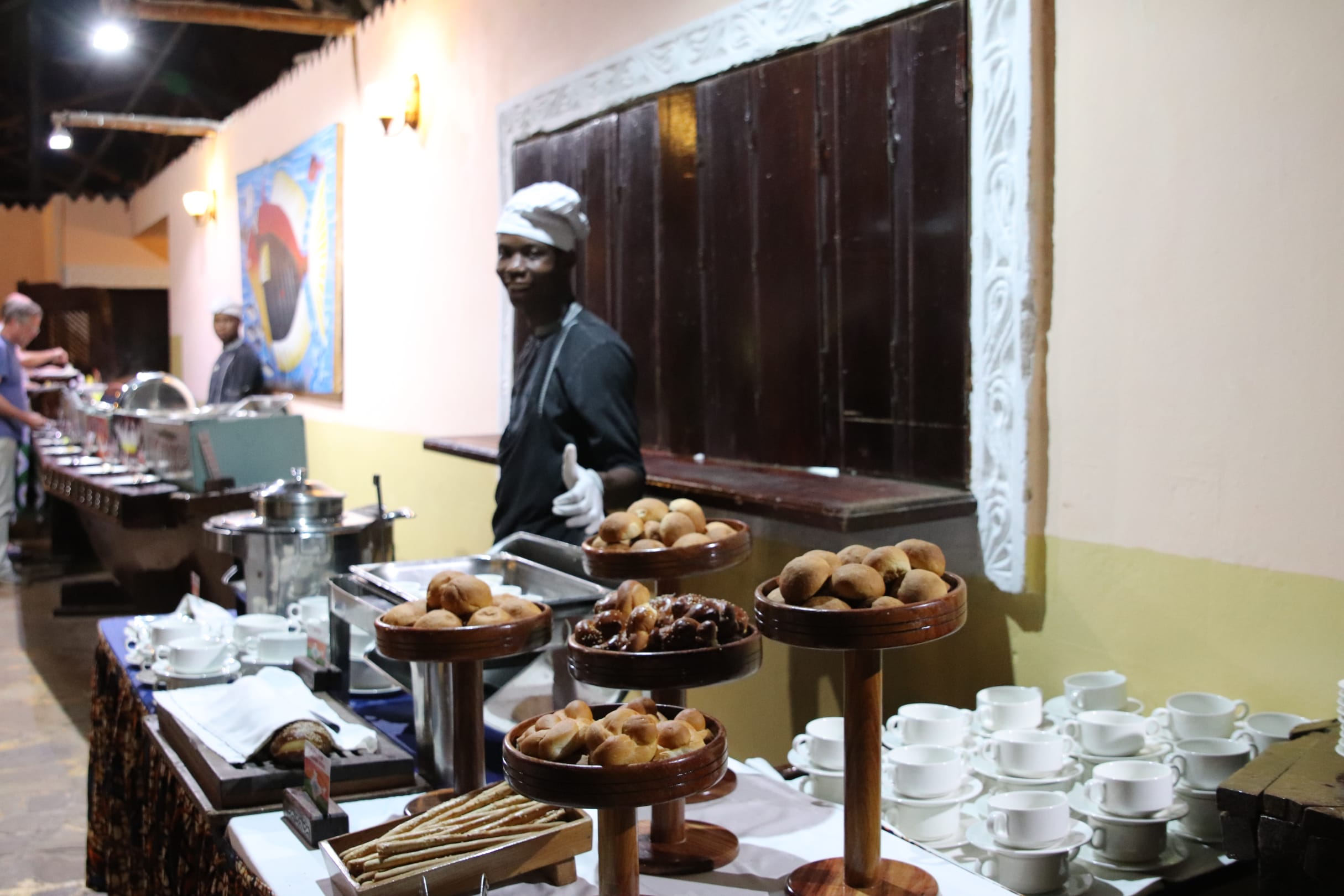 Abendessen. Suppenstation und Hauptspeisen im Hintergrund