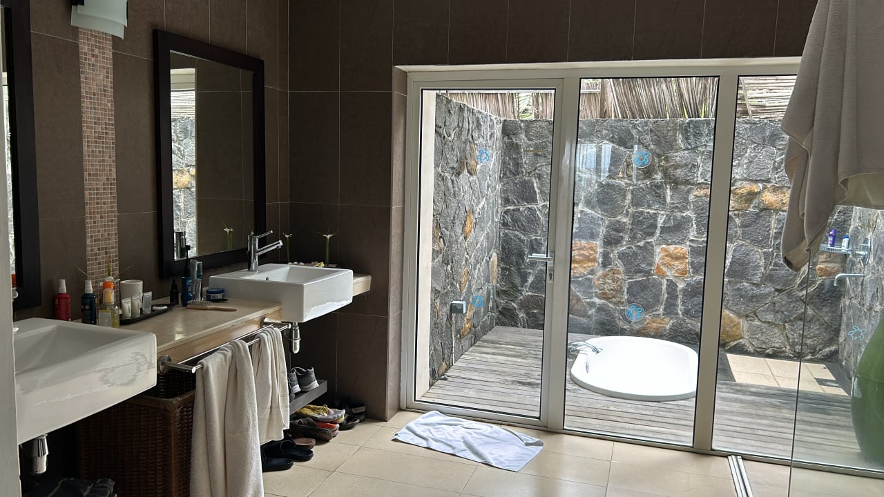 Geräumiges Bad mit zusätzlicher Außendusche.