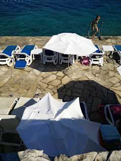 HotelstrandAuch die Ansicht zum Hotelstrand bietet kein anderes Bild. Alle Liegen, Sonnenschirme und anderes Zubehör war verschmutzt und kaputt