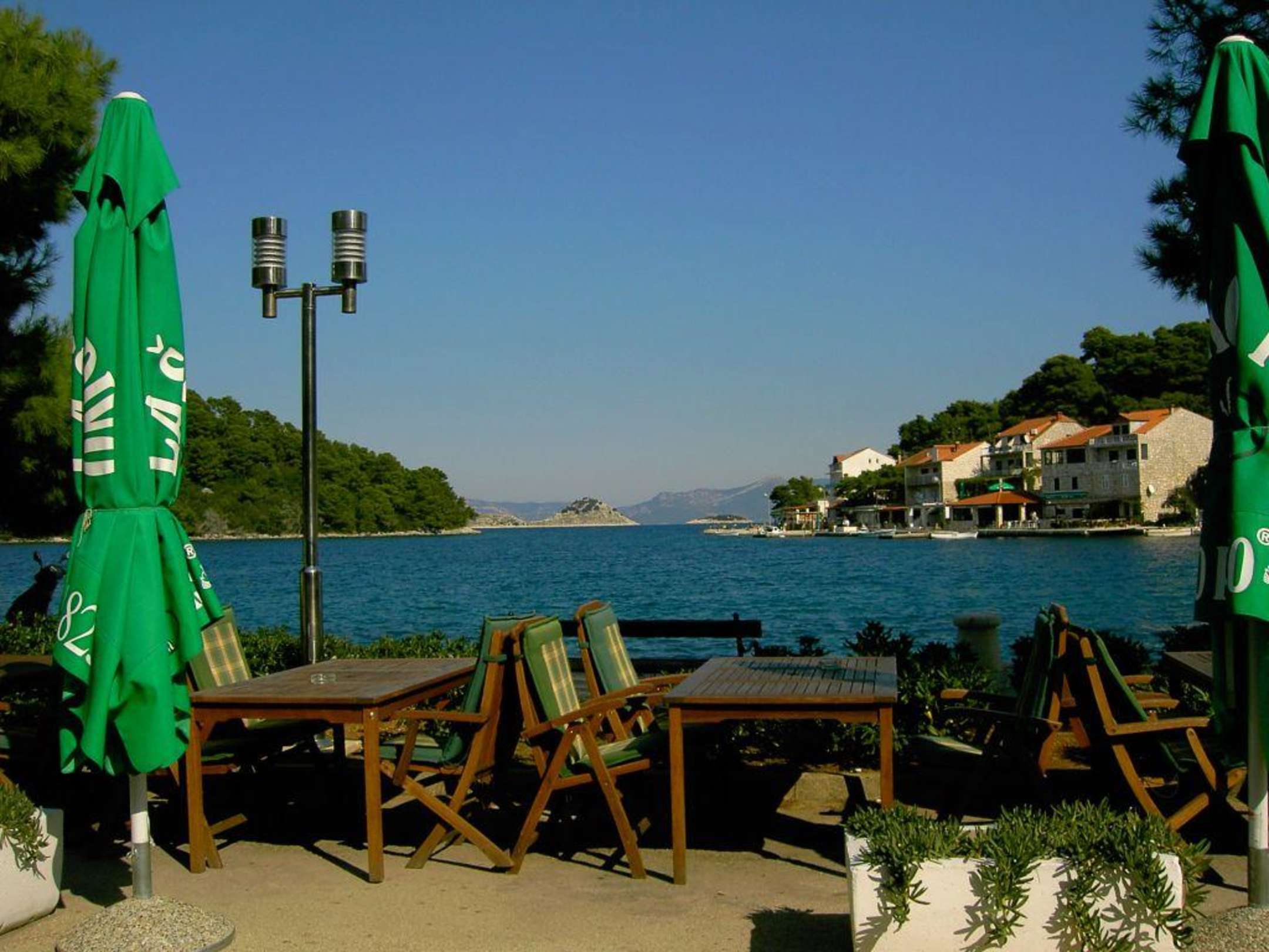 Blick von der Pizzeria Richtung Westen.Die Pizzeria liegt unmittelbar neben dem Hotel Odisej. Ein herrliches Plätzchen.