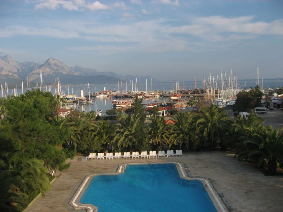 Kemer, Hotel Özkaymak-Marina , der Hotelpool direkt vor dem Hafen ( auf der anderen Seite des Hotels gibt es einen 2. Pool mit 3 Wasserrutschen). Dieser Ausblick auf den Hafen und die Berge war einfach traumhaft.