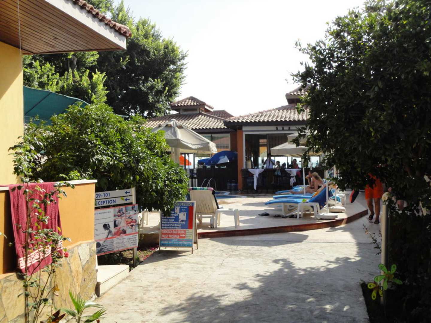 Weg von den Zimmern zu Pool & Restaurant