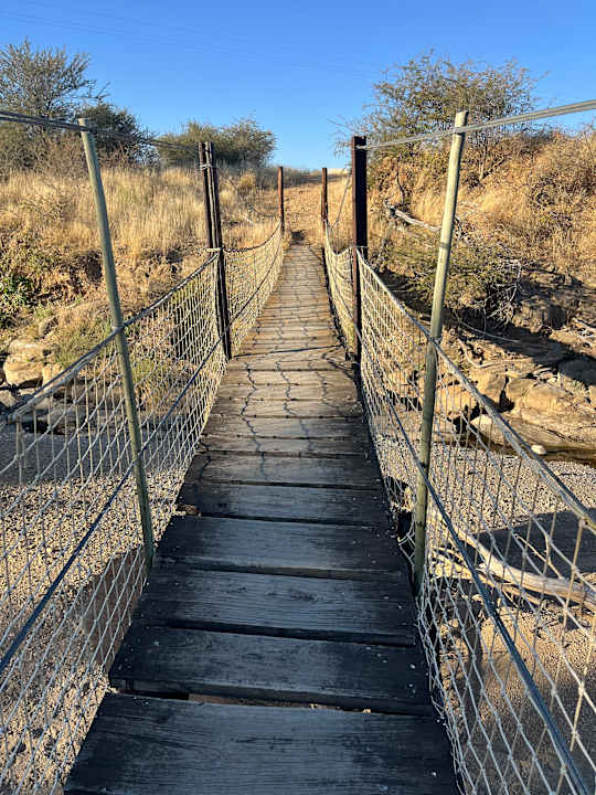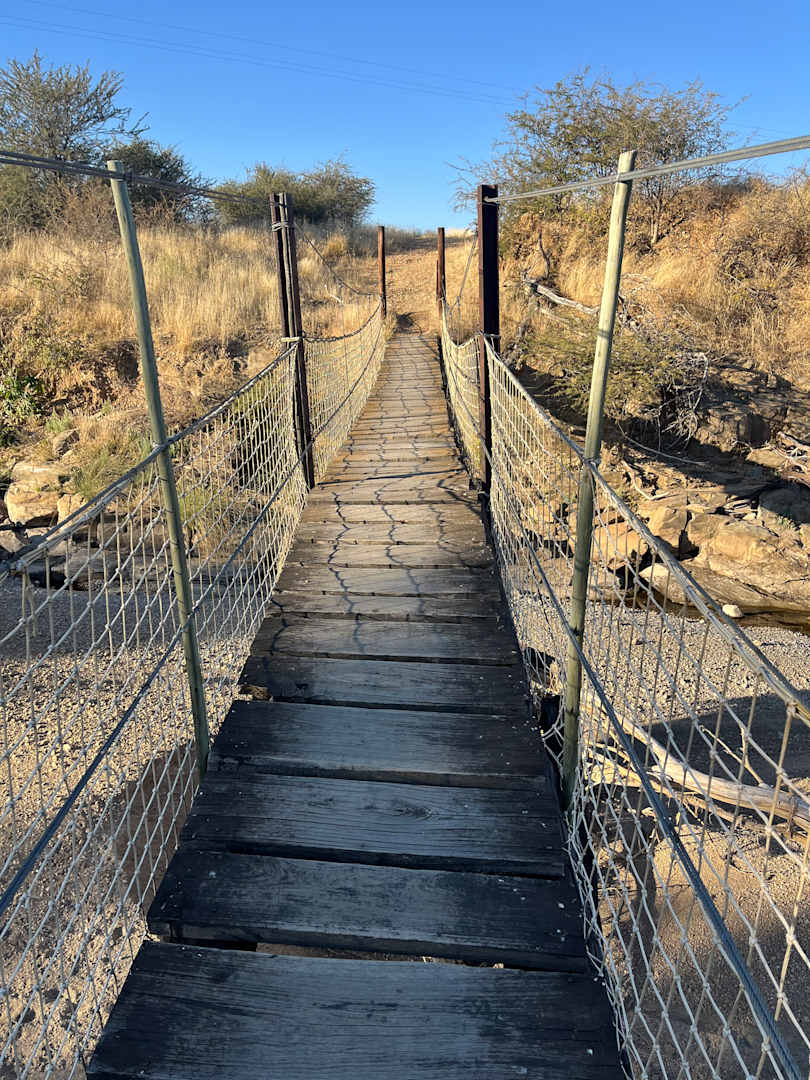 AusblickIn der Regenzeit führt die Brücke über einen reißenden Strom. Im Juli (Winter) über ein ausgetrocknetes Flussbett.
