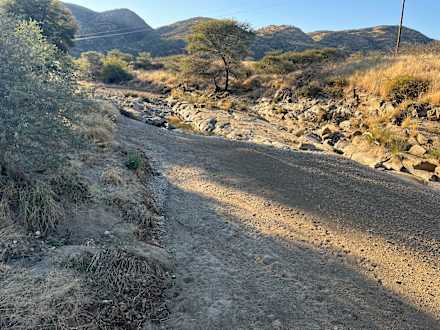 Trockenes Flussbett im Juli vor der Lodge.