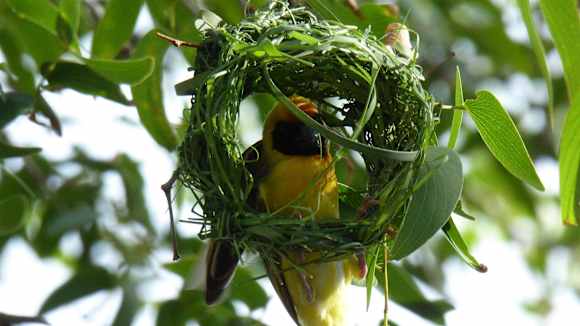 Ein Webervogel beim Nestbau. Direkt vor unserem Zimmer.