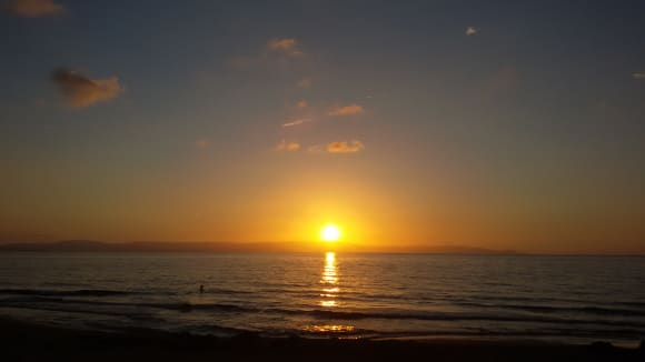 Sonnenuntergang am Hotelstrand. Im Hintergrund die Insel Zakynthos
