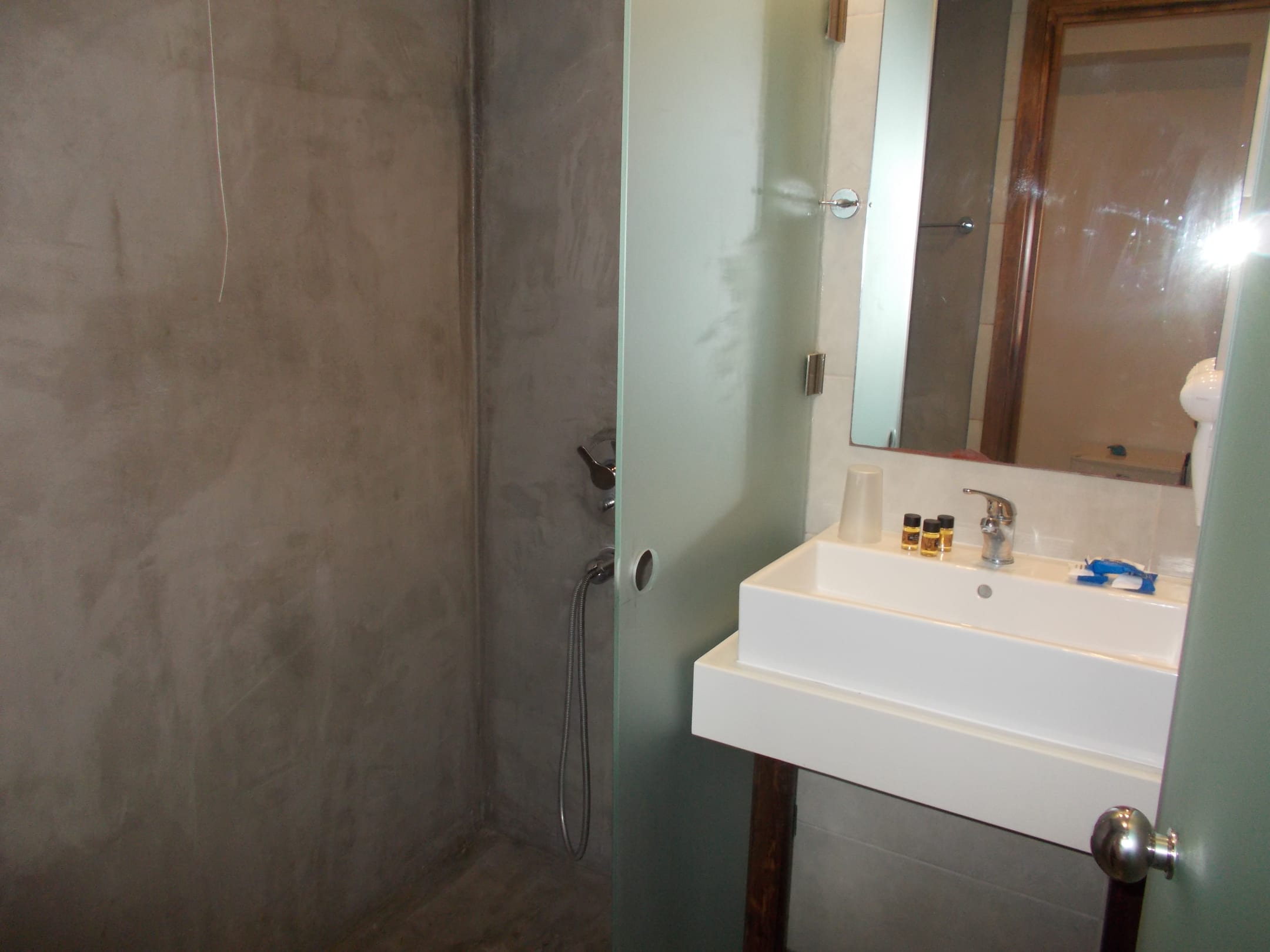 Dusche nicht fertig, keine Fliesen und Abfluss kaputt, Spiegel dreckig