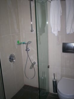 die Dusche (ohne Tür...) und die Toilette