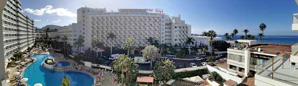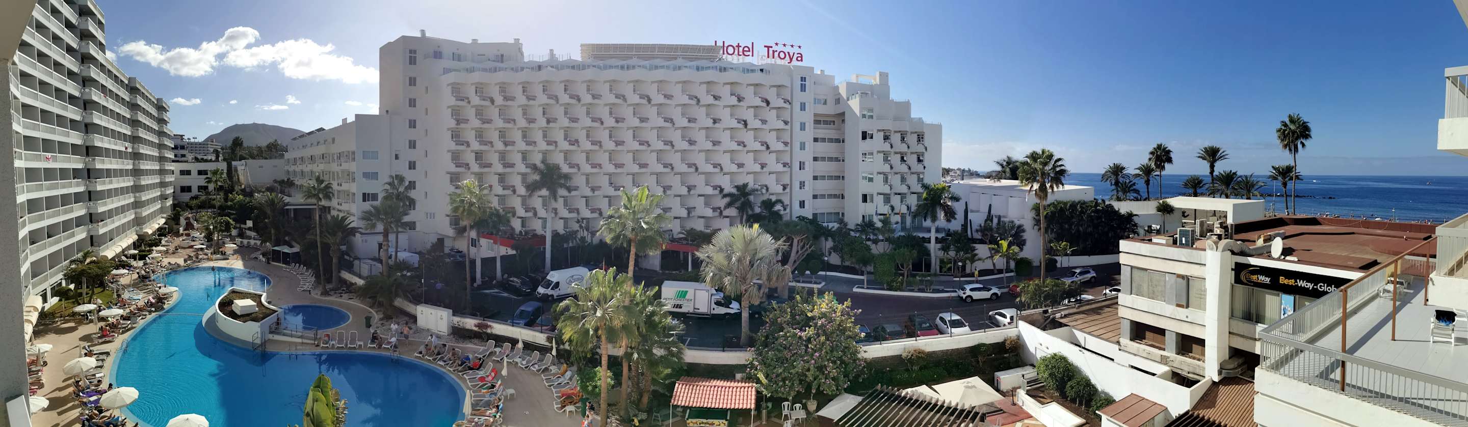 AusblickPanoramafoto vom Hotel mit Pool und Strand. Gegenüber befindet sich das Hotel Troya