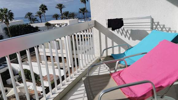 Zwei Liegen auf dem Balkon und Blick bis zum Strand