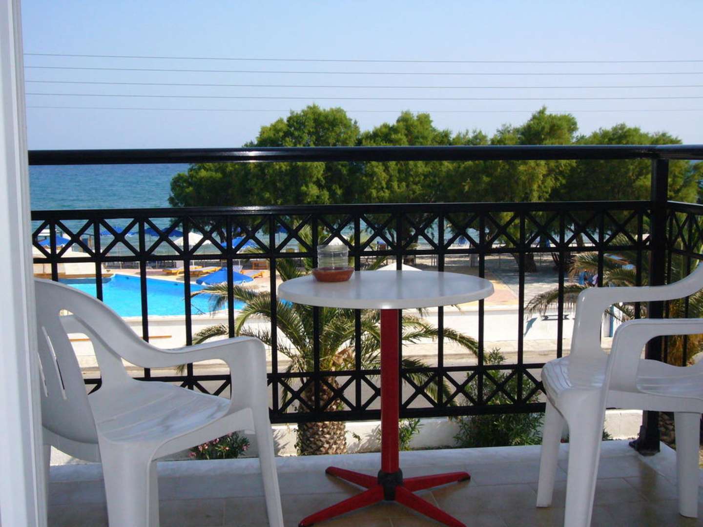 Blick auf Meer und Poolbereich vom Balkon aus