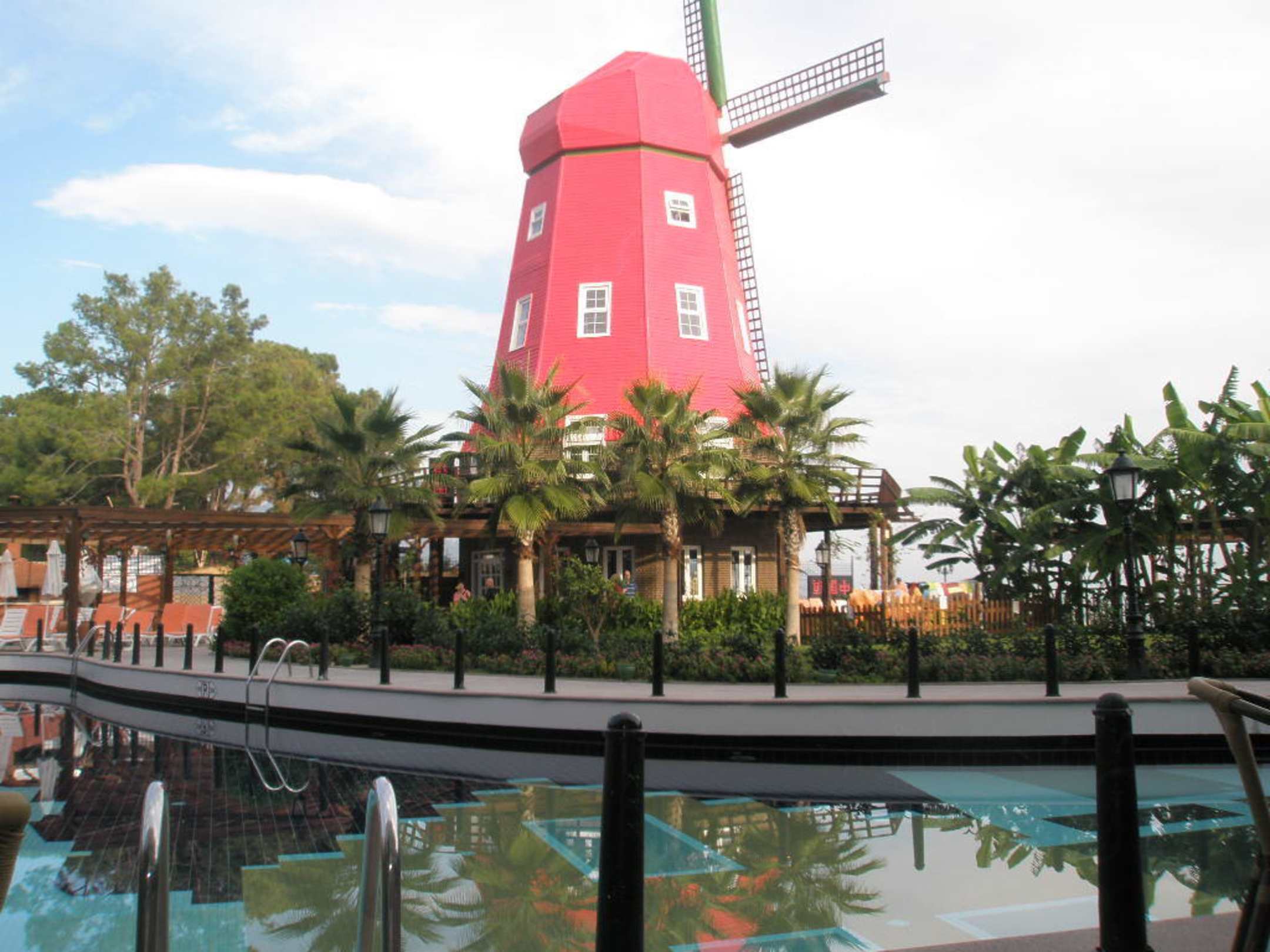 Große Windmühle zwischen Pool und Strand.