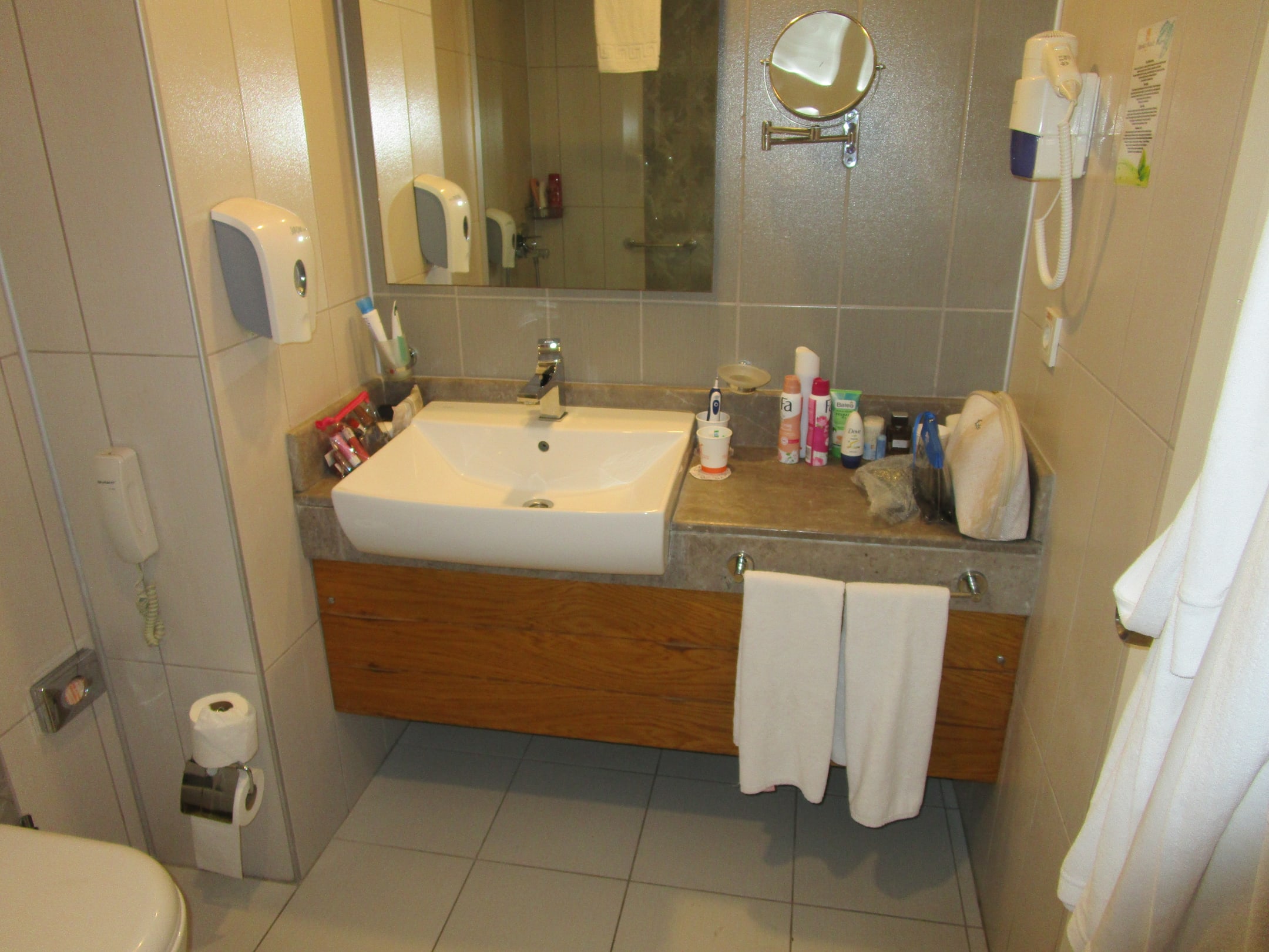 Ausreichend Ablagefläche neben dem Waschtisch im Doppelzimmer