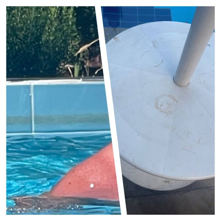 Zustand des Poolrand und der Tische an den Sonnenschirmen