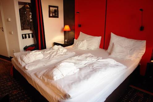 Executive-Zimmer mit DoppelbettStatt eines Kleiderschranks gibt es eine mit Vorhang abgetrennte Kleidernische.