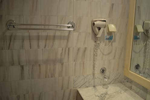 Föhn und Handtuchhalter an der Wand