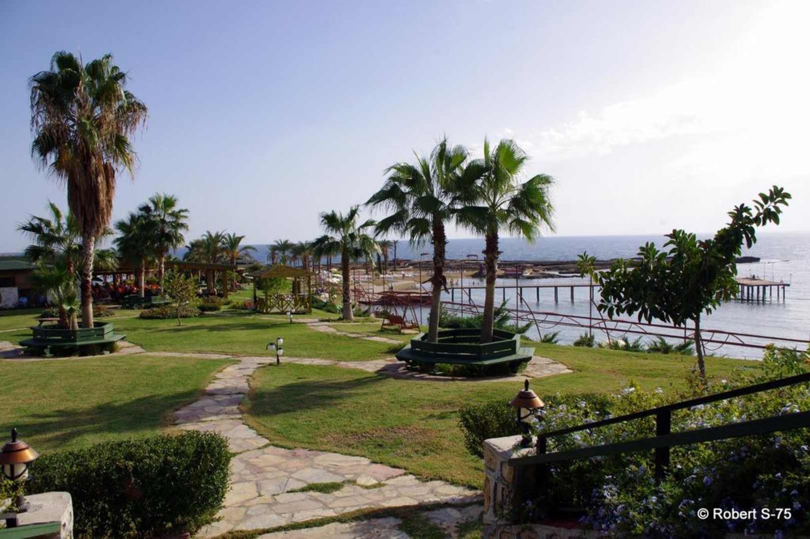 Ogród, w tle morze i molo