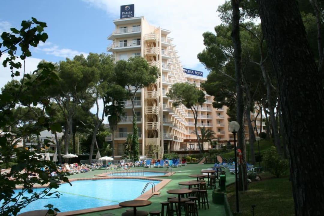 Hier ein Blick vom Kinderspielplatz auf Pool und Hotel