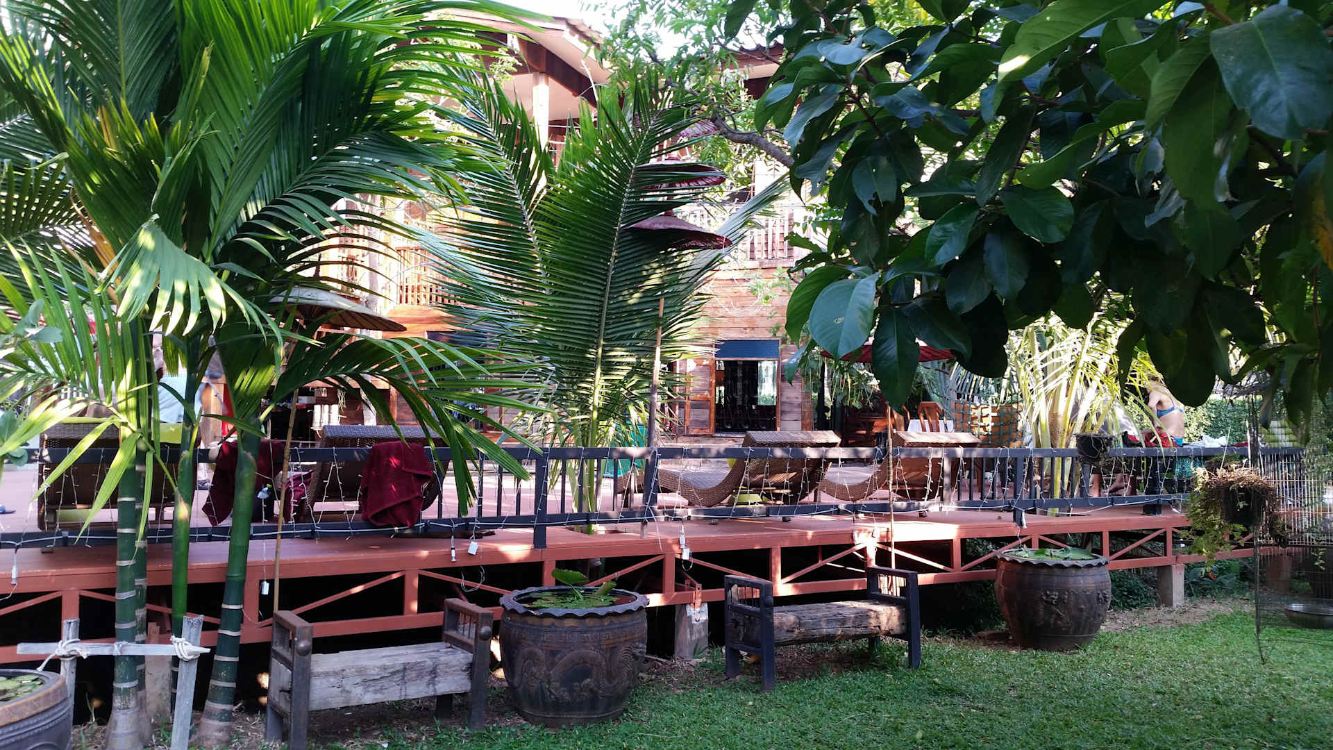 Garten, im Hintergrund Terrsse zum Pool