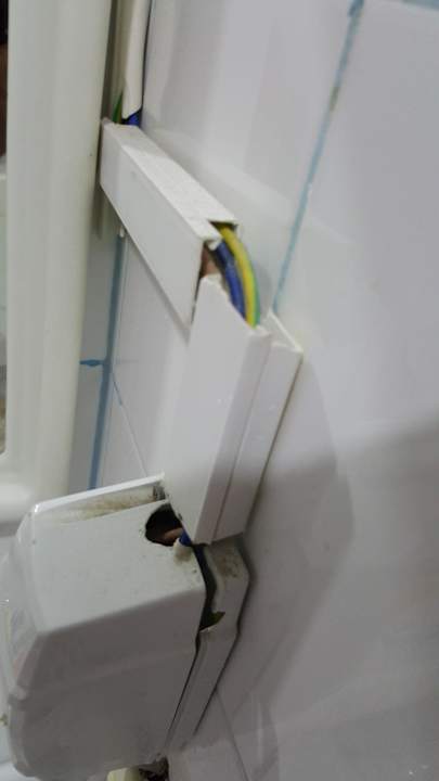 Badezimmer voll mit Kabelsalat gerade wo man Haare föhnt Manager informiert er hat gesagt er kann nichts dafür er lebt selber in so eine Zimmer uns nie was passiert das war sein Äußerung