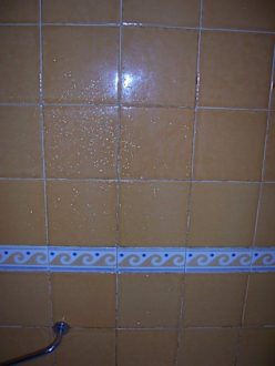 DuschwandDie Duschwand über der Badewanne mit Schimmel in den Fugen.