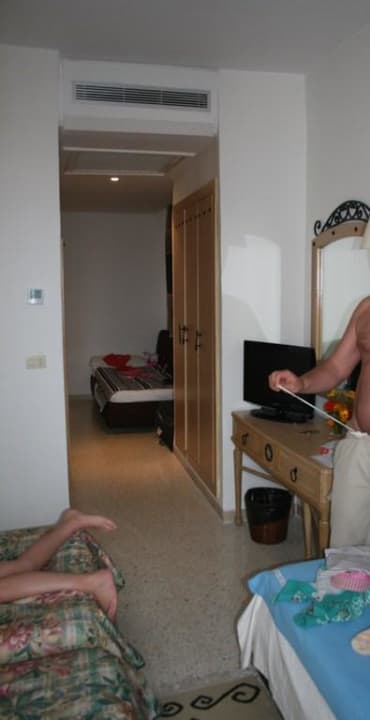 Das Foto ist von der Balkontür mit Blick in das Zimmer fotografiert. Links befindet sich das Doppelbett, rechts ein Bett, ebenso eines weiter hinten. Hinten links befindet sich die Zimmertür.