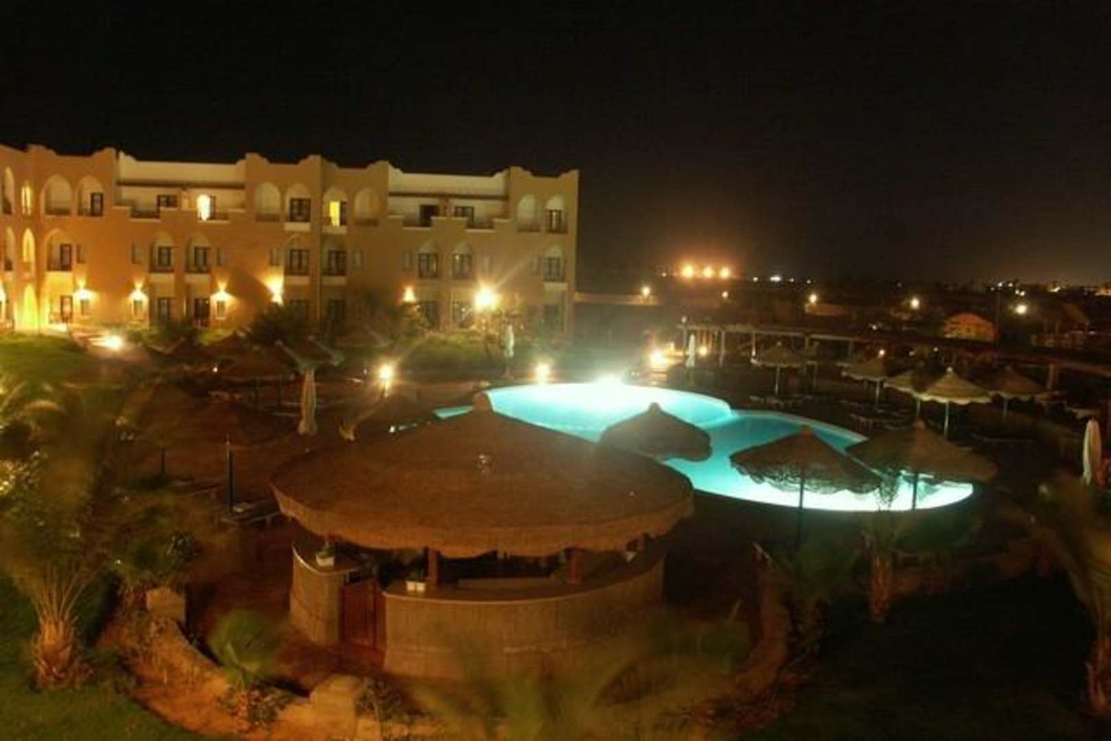 Hotel Palmyra Resort widziany nocą z okna mojego pokoju.