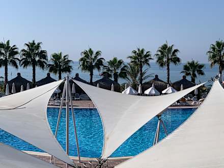 Blick vom Speiseraum über den Pool zum Strand!