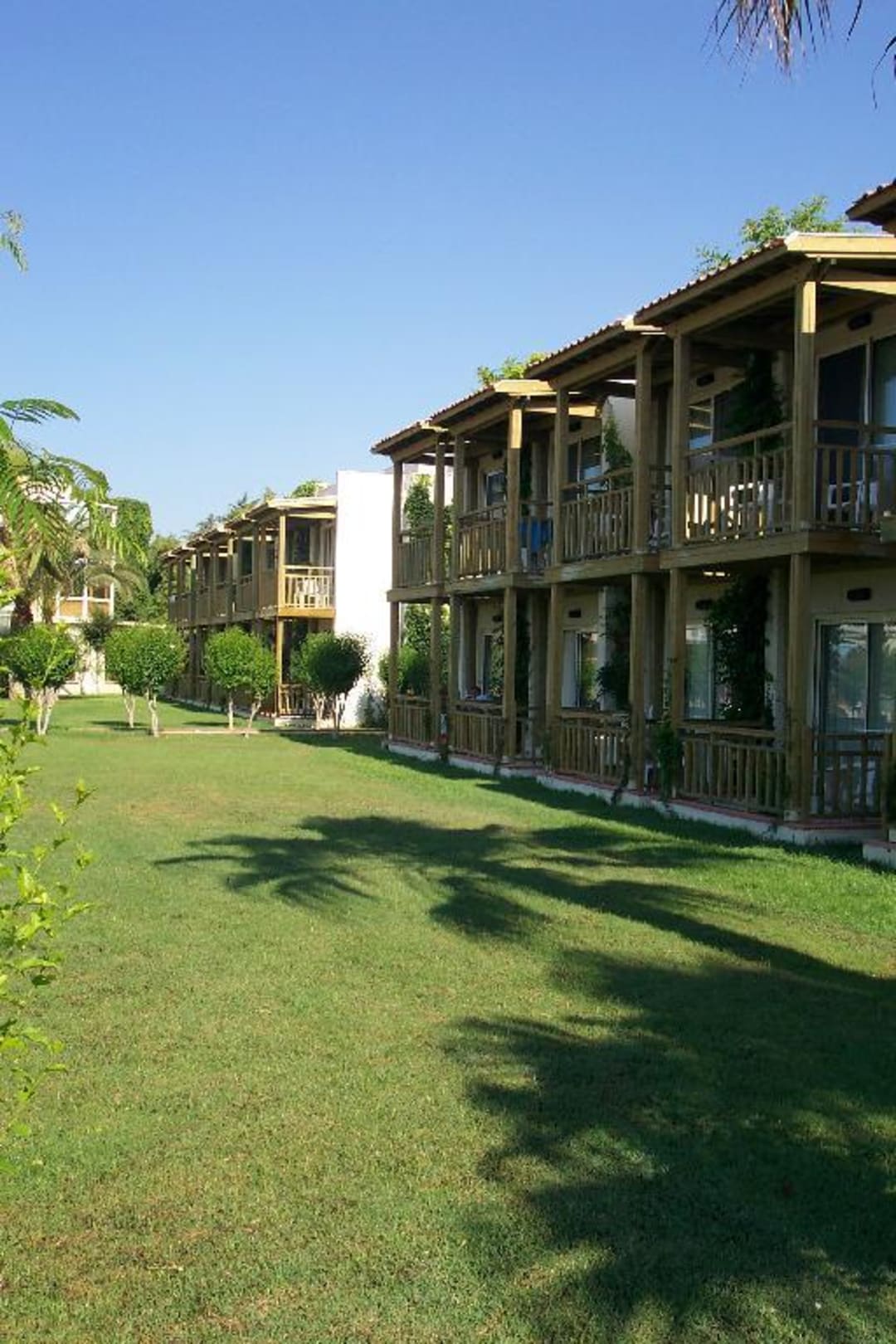 Blick vom Garten auf die zweistöckigen Hotelzimmer in den Nebengebäuden.