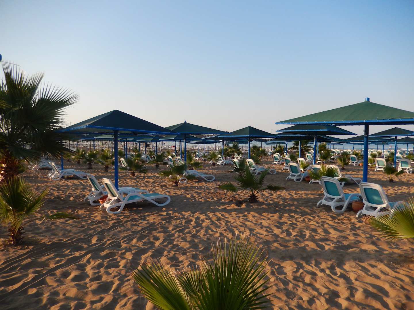 Bequeme Liegen, zwischen den Schirmen Palmen