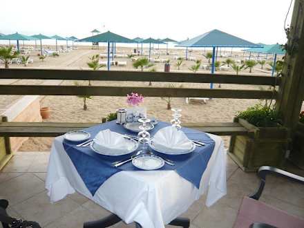 Tisch abends im Strand-Restaurant mit Blick auf den Hotelstrand