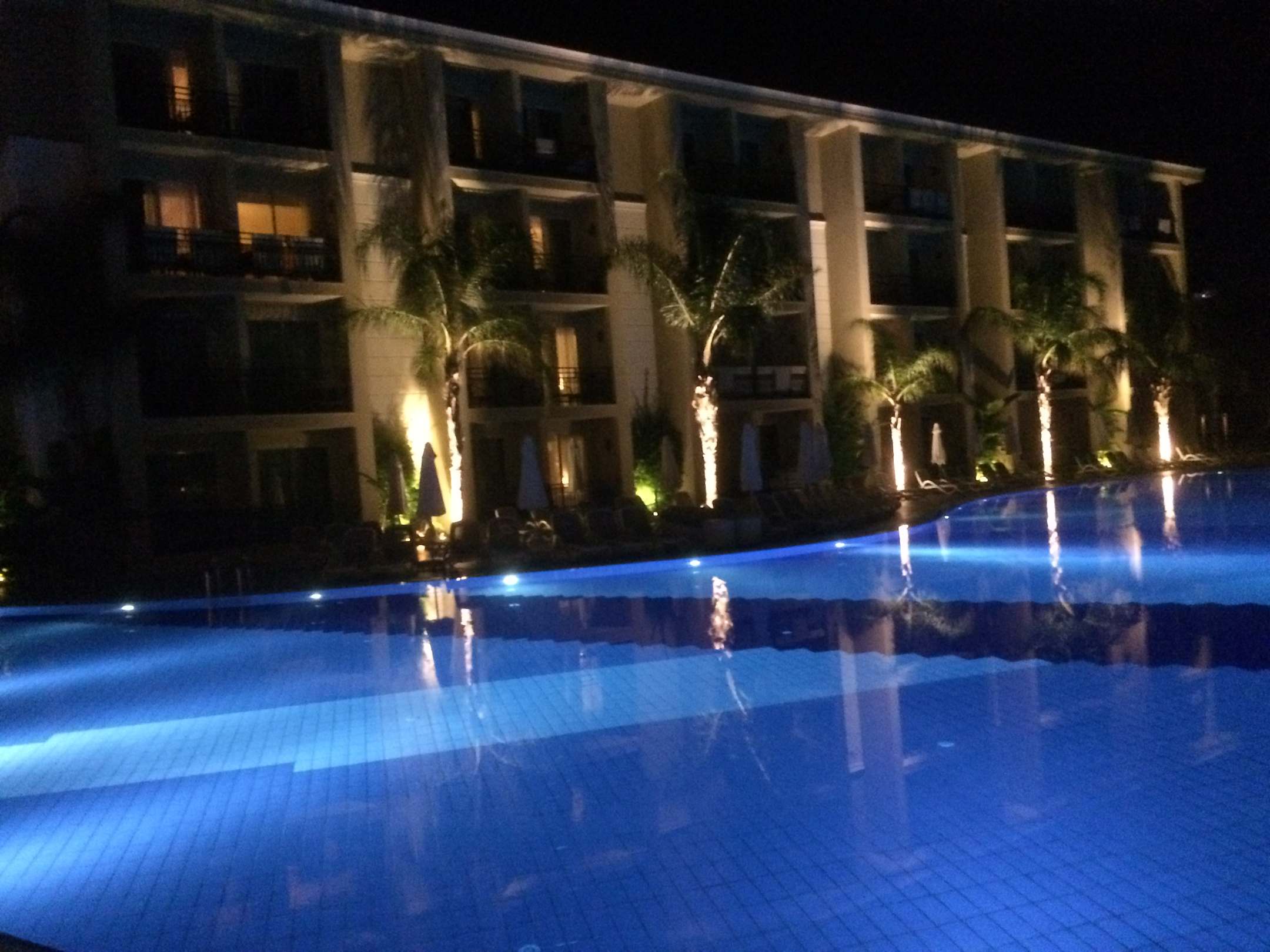 Pool mit Hotel bei Nacht