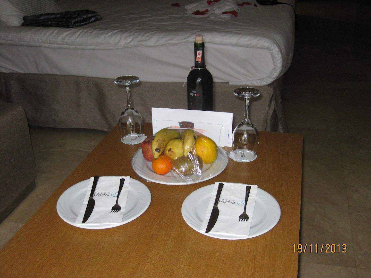Obst, Wein und eine Geburtstagskarte des Hotels