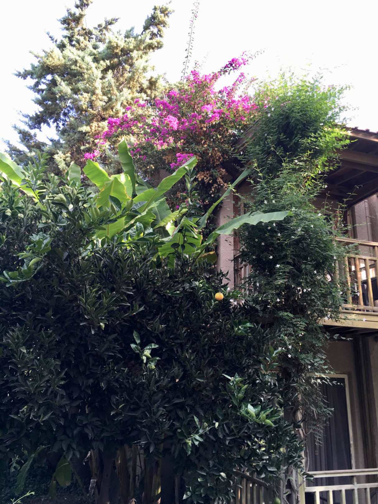 Gartenanlage und Teilblick auf Bungalow