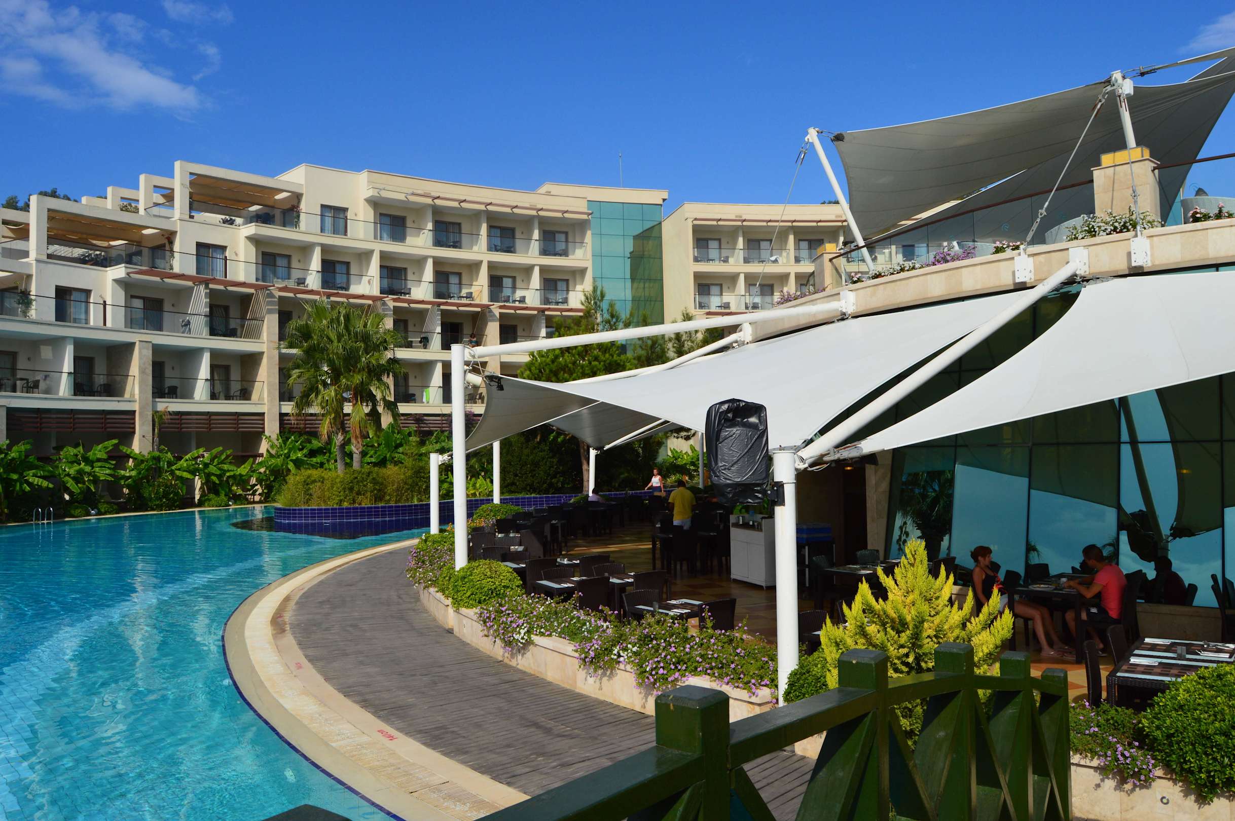 Links Pool rechts davon Aussenterrasse Restaurant