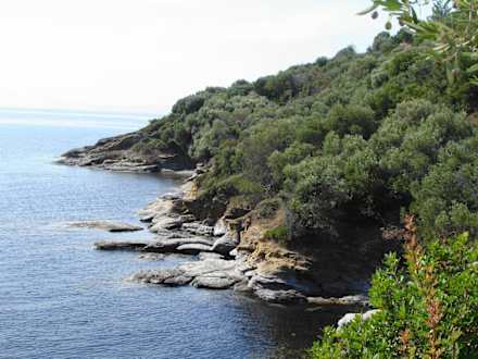 Blick auf die Klippen hinter dem Holzsteg