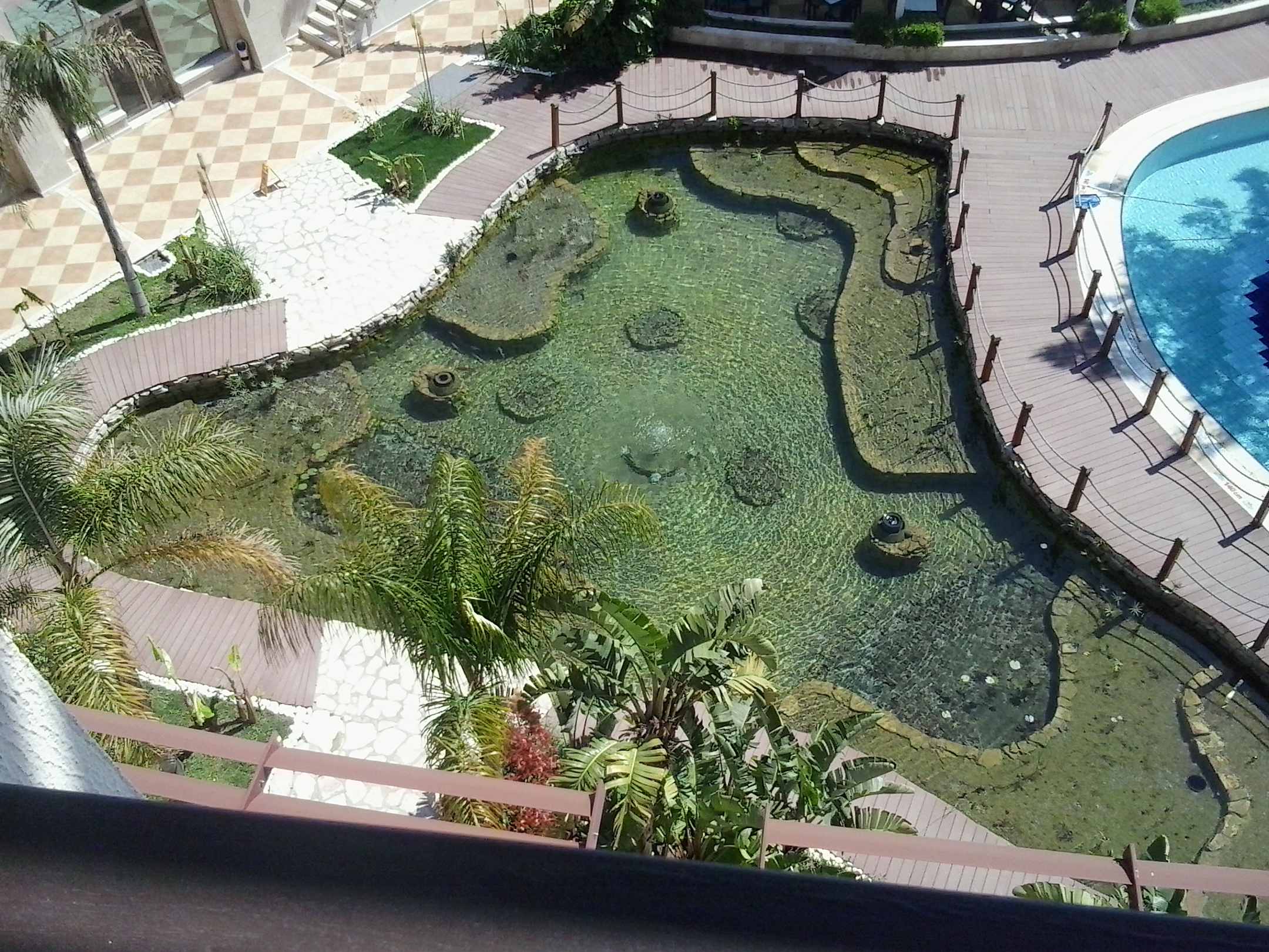 Blick vom Balkon auf einen der Teiche nahe des Pools