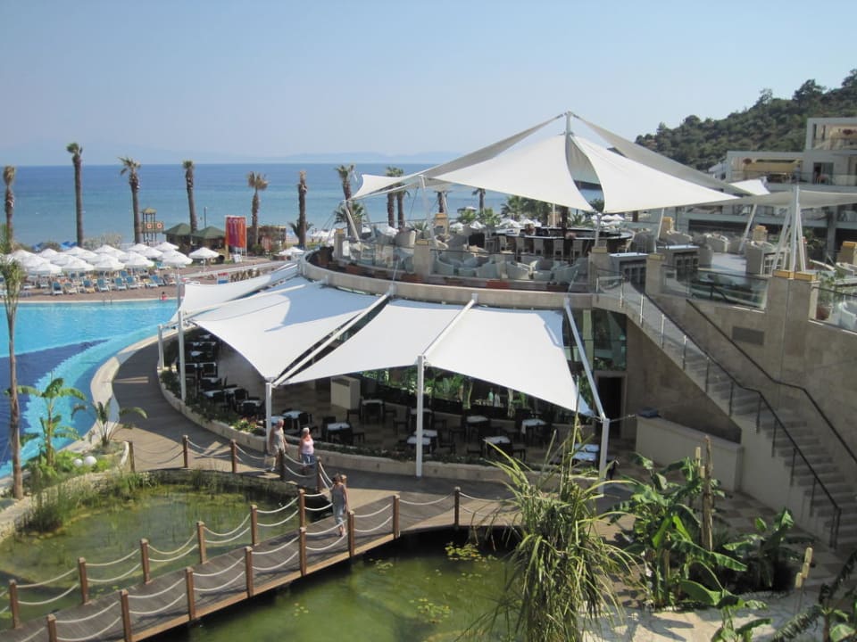 Blick vom Balkon auf Terrasse und Restaurant
