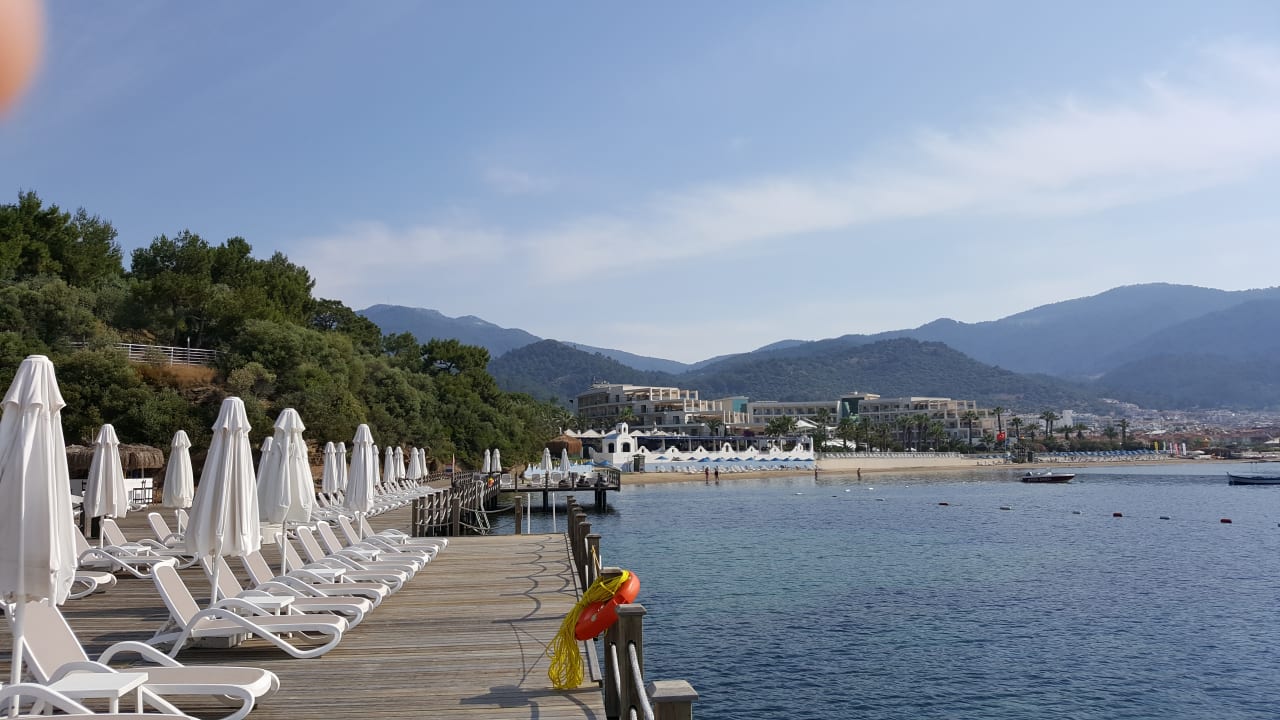 Blick vom Silent Deck auf das Hotel und den Strand