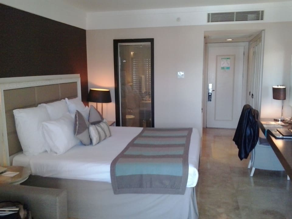 ZimmerEinzelzimmer mit Kingsize-Bett. Blick in Bad und begehbare Dusche lässt sich ggf. per Jalousie öffnen/vehindern. Zimmer hat zudem gemütliches Sofa und - rechts teils sichtbar - weitläufigen Schreibtisch sowie mehr als genug Stauraum in Flur-Schränken