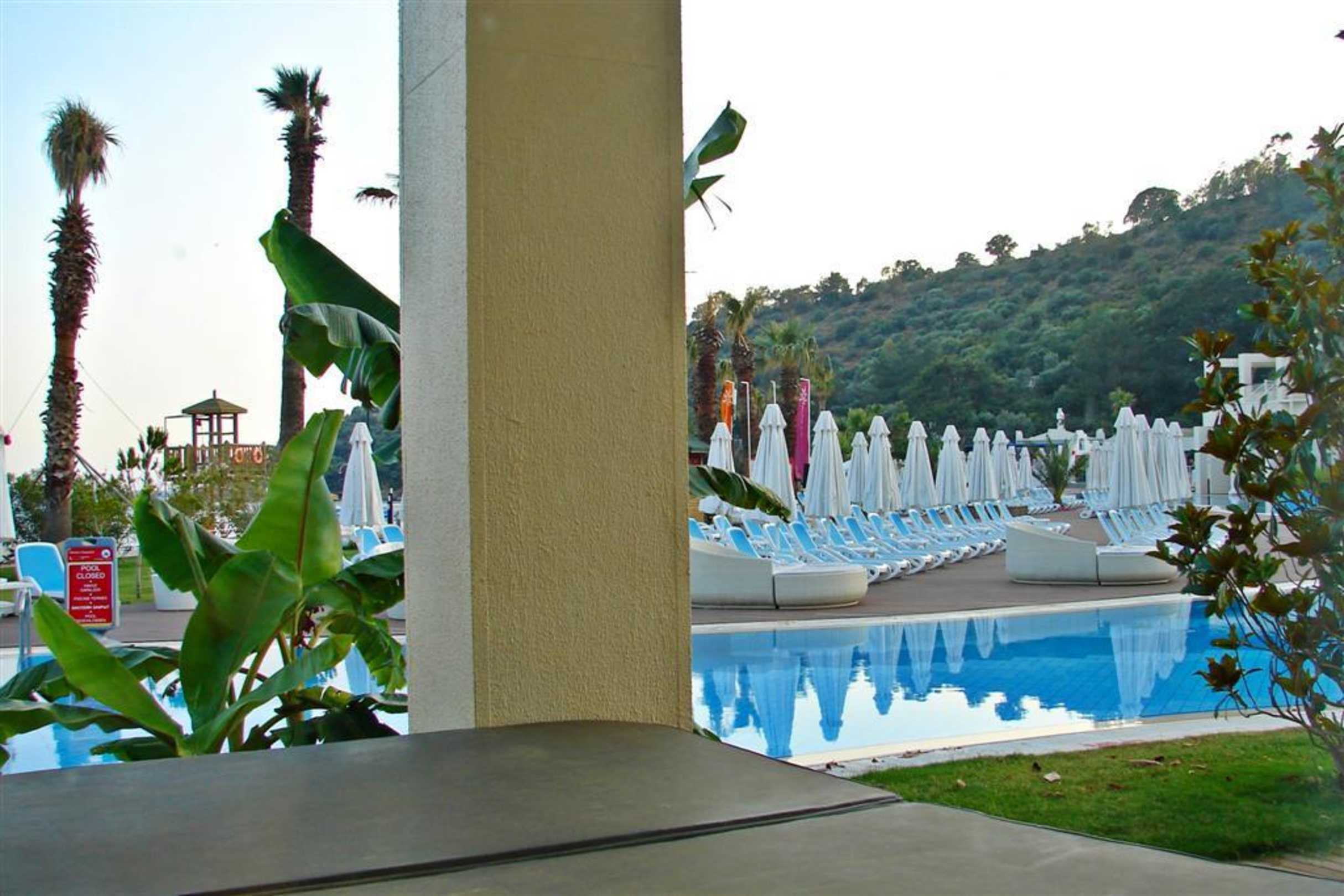 Blick vom Whirlpool auf einen Teil des Liegebereichs