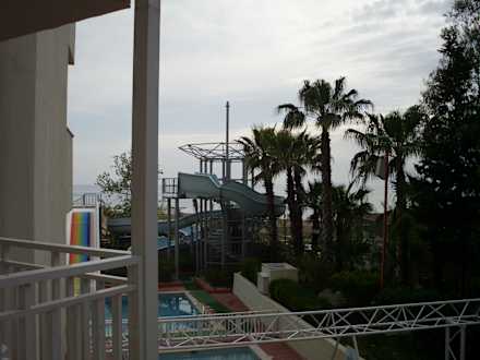Ausblick vom Balkon auf die Kinderrutschen