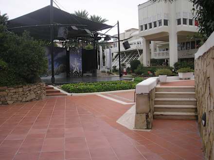 Links Abendanimation, hinten Hallenbad