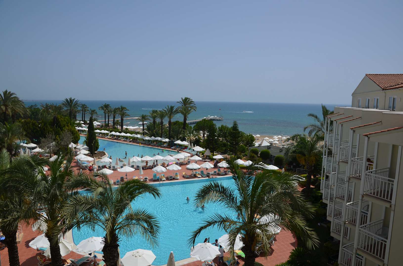 Ausblick vom Balkon unseres Zimmers auf den Pool und das Meer.