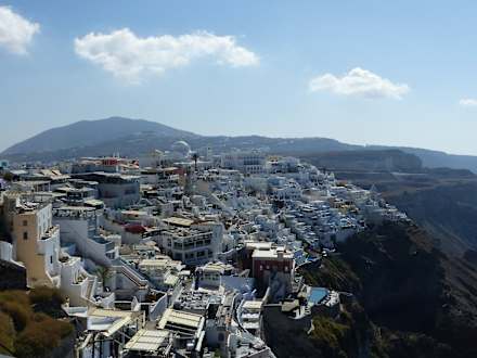 Stadt Fira, Hotel liegt mittig im Bild unterhalb der Kirchenkuppel