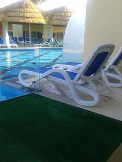 Вид с балкона на бассейн - стоят собственные лежаки